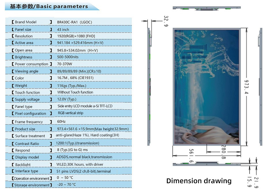 Product details:43 inch ultra-thin side entry high brightness LCD module