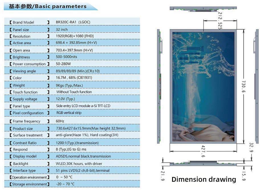 Product details:32 inch ultra-thin side entry high brightness LCD module